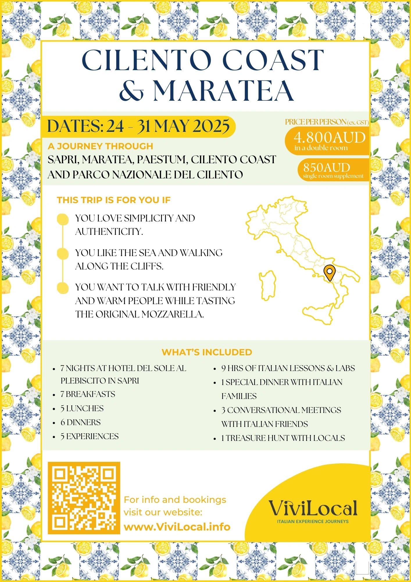 The Cilento Coast is a stunning stretch of coastline located in the Campania region of southern Italy, along the Tyrrhenian Sea. Known for its pristine beaches, crystal-clear waters and rugged cliffs, the Cilento Coast offers breathtaking views and a quiet atmosphere. The region is characterized by charming fishing villages, picturesque seaside towns, and lush Mediterranean vegetation.